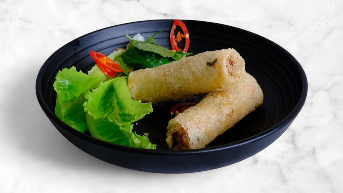 ספרינג רול ויאטנמי במילוי פרגית קצוצה אטריות שעועית וירקות עם עלי חסה פריכים, בזיליקום, צ'ילי, נענע, כוסברה ומטבל סויה מתובלת