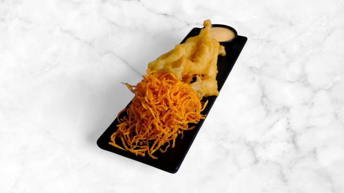 אצבעות דג לברק מצופות טמפורה מוגש עם ספייסי מיונז