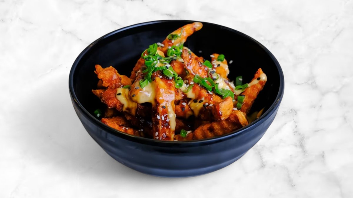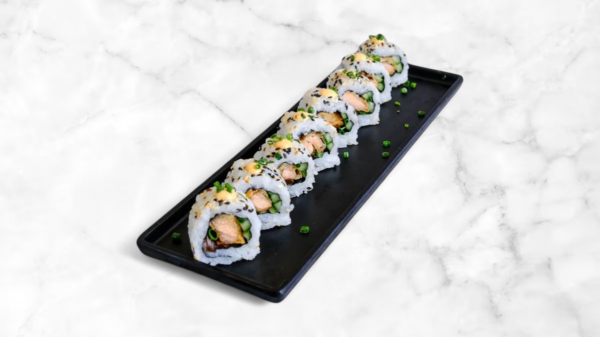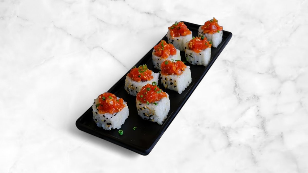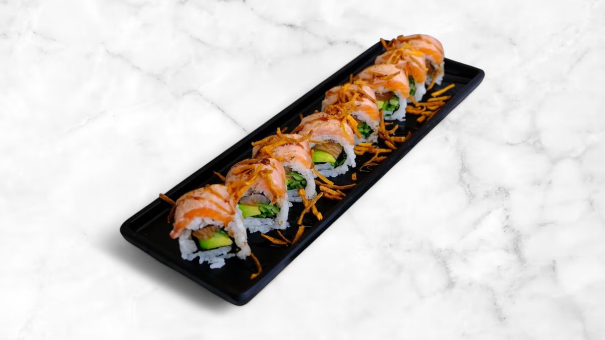 סלמון מטוגן קצוץ, ספייסי מיונז, אבוקדו, שומשום, סריראצ'ה, ועירית במעטפת סלמון טרי צרוב, טריאקי וקריספי בטטה