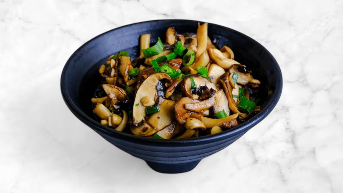 פטריות פורטובלו מוקפצות ברוטב טריאקי, קשיו, שומשום ובצל ירוק