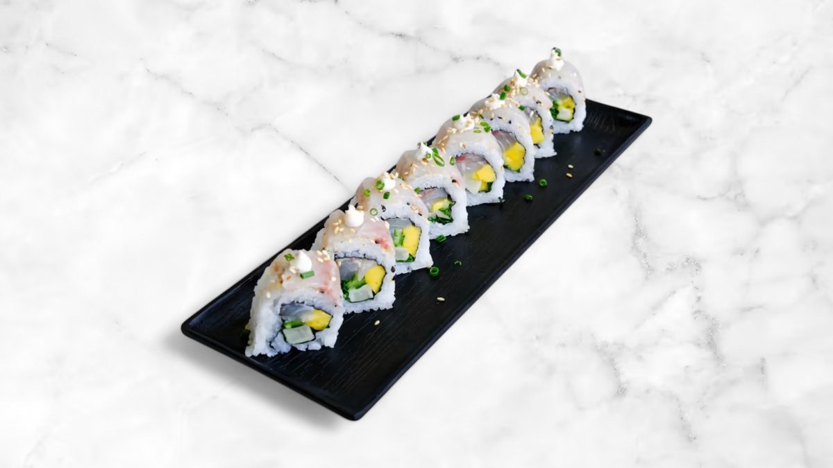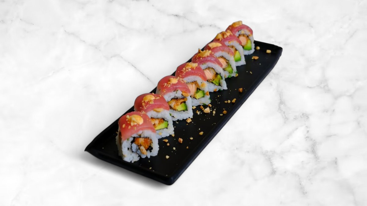 סלמון בטמפורה, סריראצ'ה, בוטנים קצוצים ועירית במעטפת טונה, אבוקדו, שבבי טמפורה וספייסי מיונז