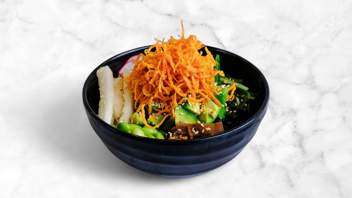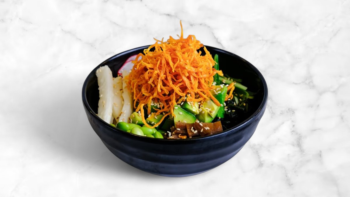 אורז סושי, אצות וואקמה, שיטאקי, צנוניות, אבוקדו, אספרגוס, מלפפון, פולי אדממה, קולורבי כבוש, בצל ירוק שומשום וקריספי בטטה