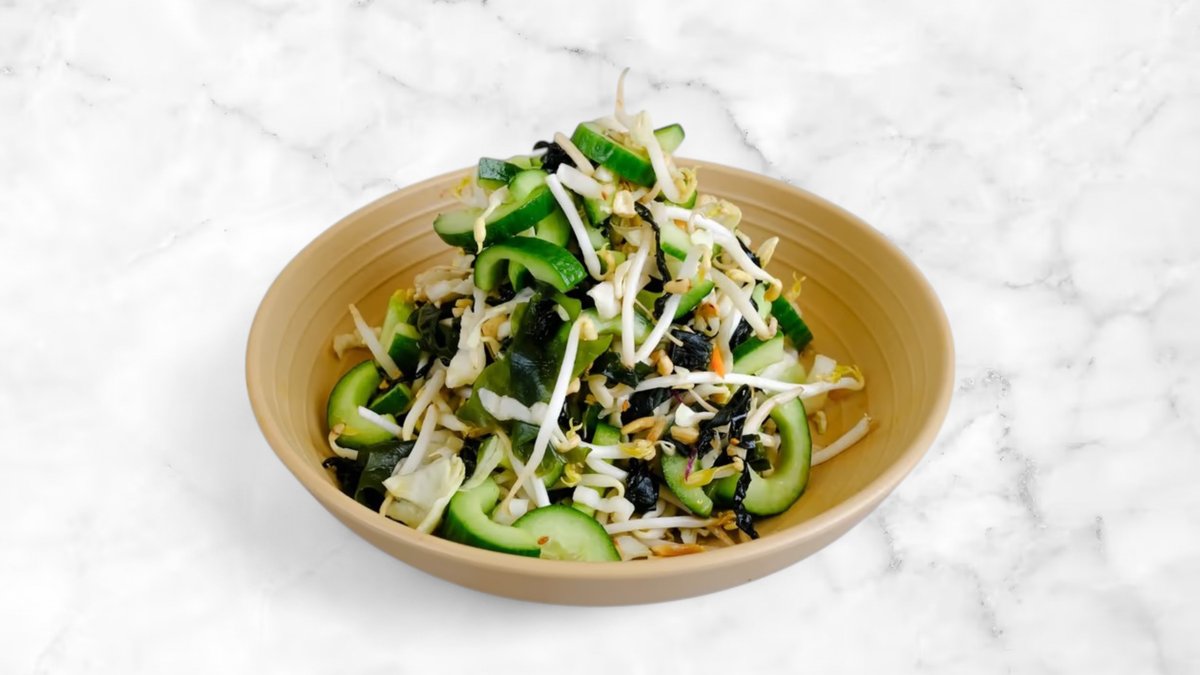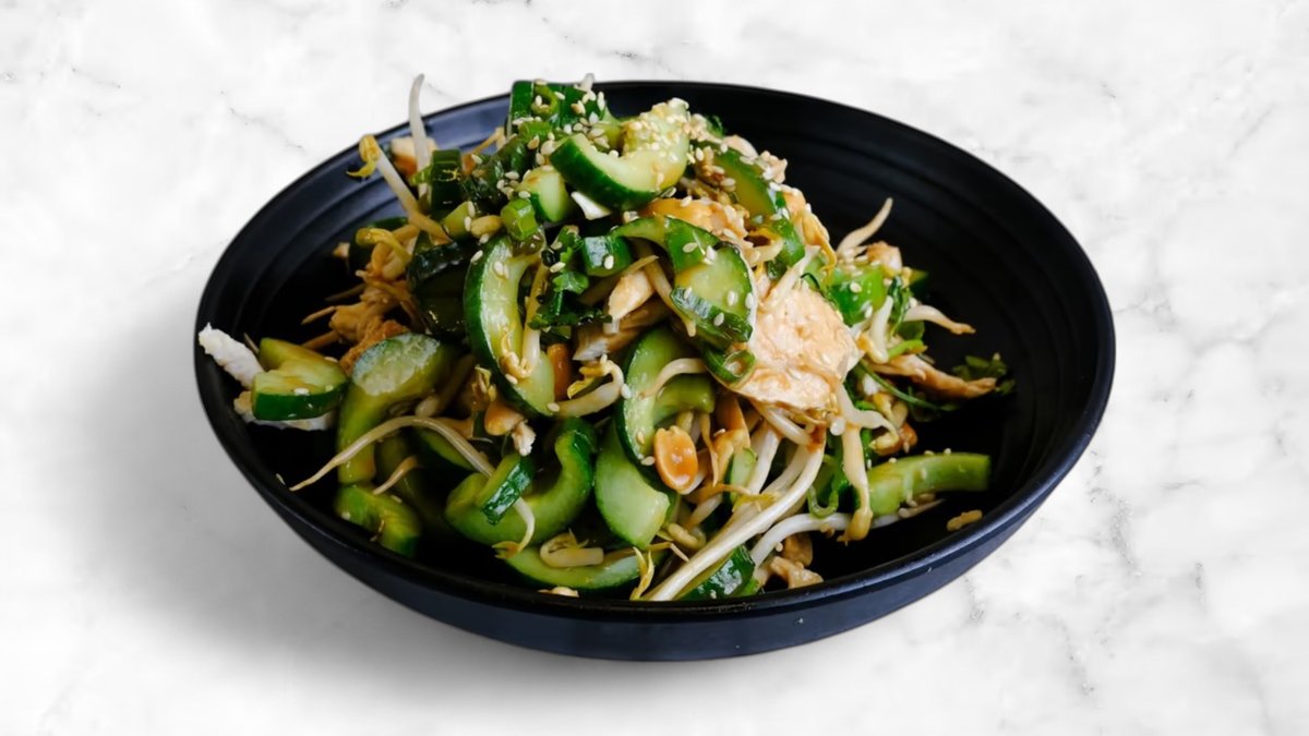 רצועות מלפפונים, נבטים, בוטנים קלויים, שומשום, כוסברה, בצל ירוק ורוטב חמאת בוטנים