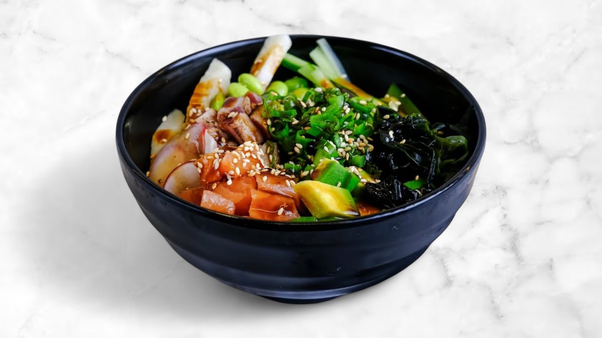 קוביות סלמון נאות, אורז סושי, אצות וואקמה, צנוניות, אבוקדו, מלפפון, פולי אדממה, קולורבי כבוש, בצל ירוק ושומשום