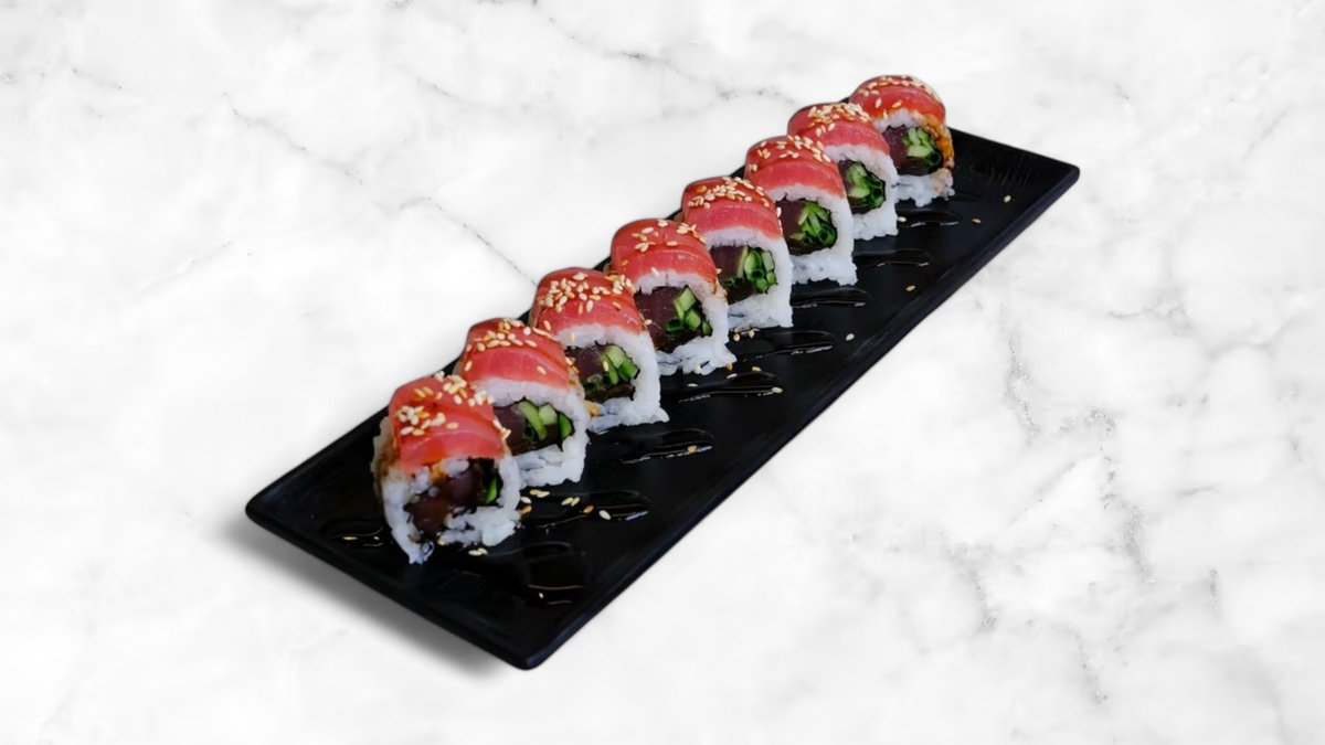 סלמון, לברק, טונה, מלפפון, ועירית במעטפת מיקס שומשום, ספייסי מיונז ופלפל צ׳ילי