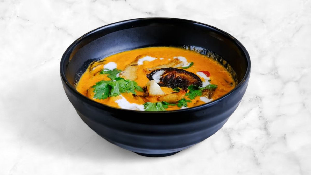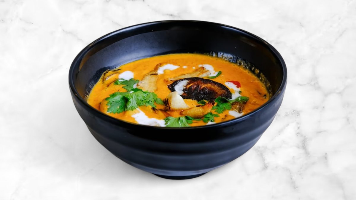 ציר ארומטי מבושם בקארי אדום וחלב קוקוס, פטריות שימאג'י, בצל, עגבניות, צ'ילי וכוסברה מוגש עם אורז מאודה