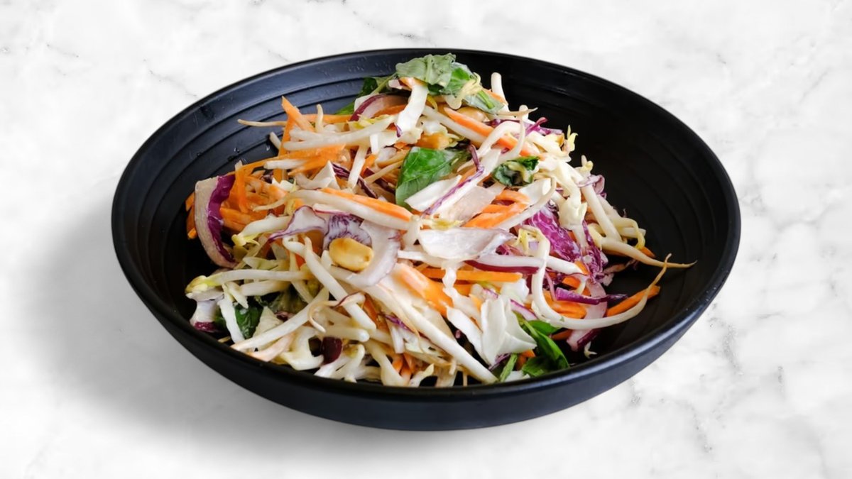 כרוב לבן, כרוב סגול, גזר, בצל סגול, צנון, נבטים, בוטנים, נענע, כוסברה, בצל ירוק, בזיליקום ורוטב איולי יוזו