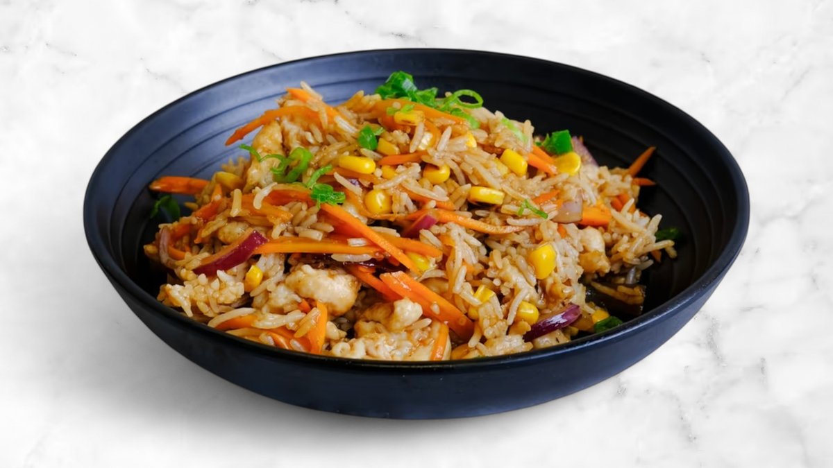 אורז מוקפץ עם ביצה מקושקשת, צ'ילי, תירס, גזר, אפונה, בצל ברוטב סויה, טריאקי, שום ובצל ירוק