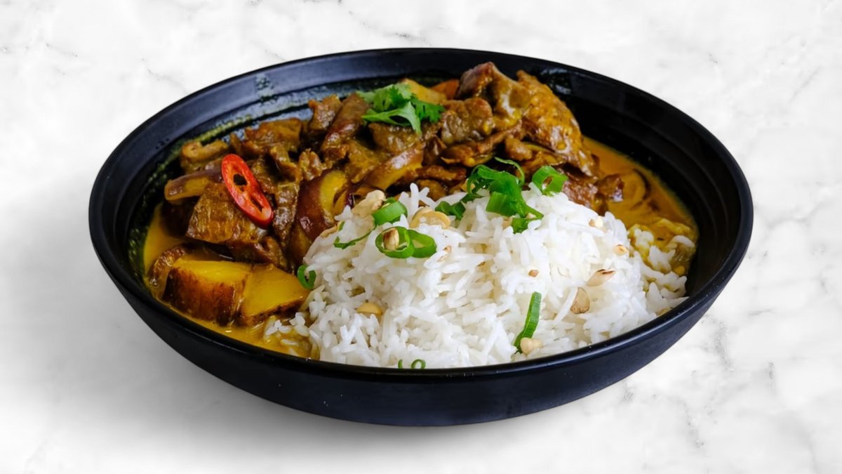 קארי צהוב, חלב קוקוס, תפו"א, אפונה, בקצו'י, בצל, צ'ילי וכוסברה מוגש עם אורז מאודה