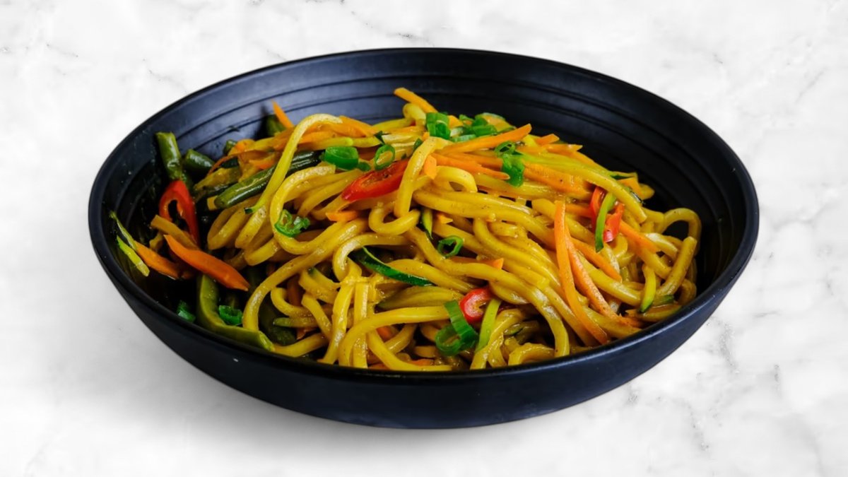 אטריות אודון, שעועית ירוקה, גזר וזוקיני ברוטב קארי וחלב קוקוס, בוטנים ובצל ירוק