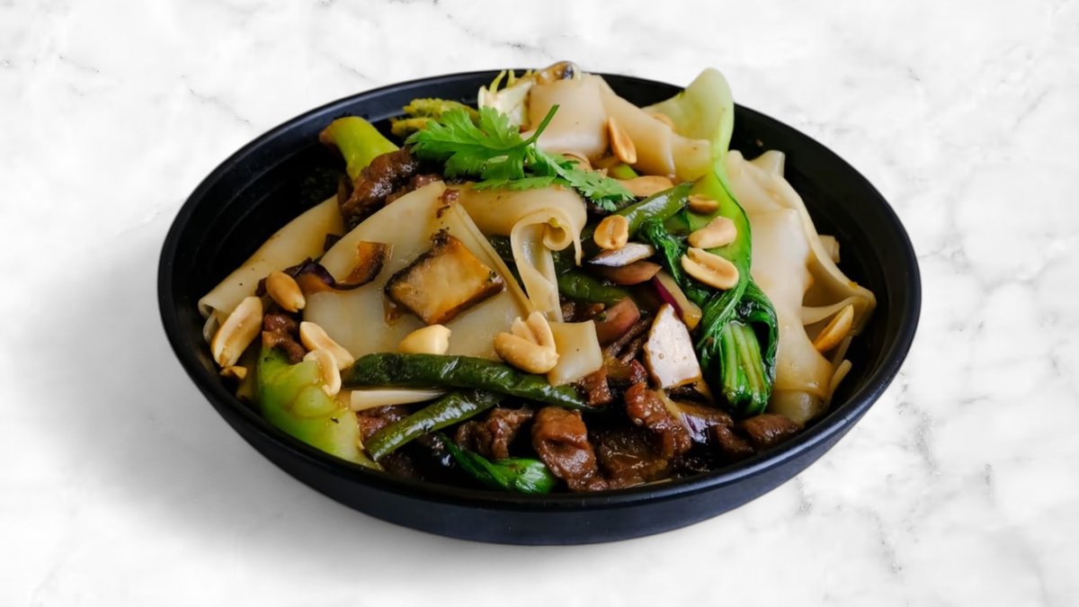 נתחי בקר ברוטב אויסטר עם אטריות אורז רחבות, ביצה מקושקשת, שעועית ירוקה, בצל סגול, פורטובלו, בקצ'וי, בוטנים, קוקוס קלוי וכוסברה