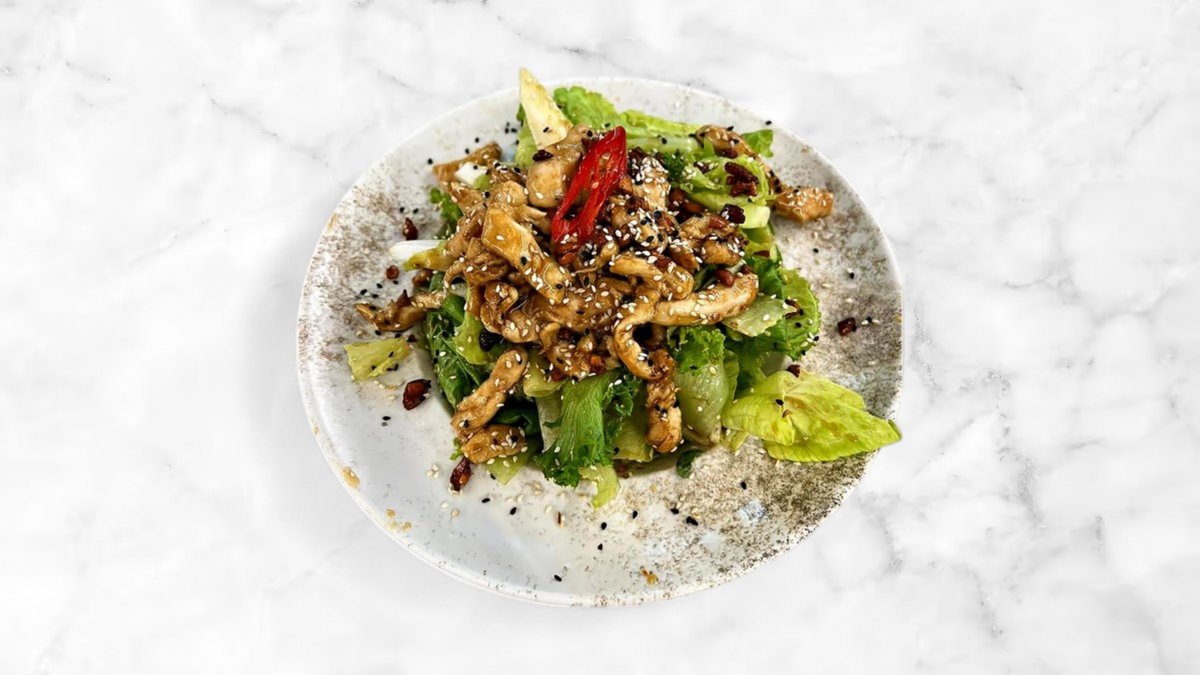 עוף מוקפץ על מצע שני סוגי חסה, ספייסי קשיו ושומשום קלוי ברוטב חמוץ מתוק