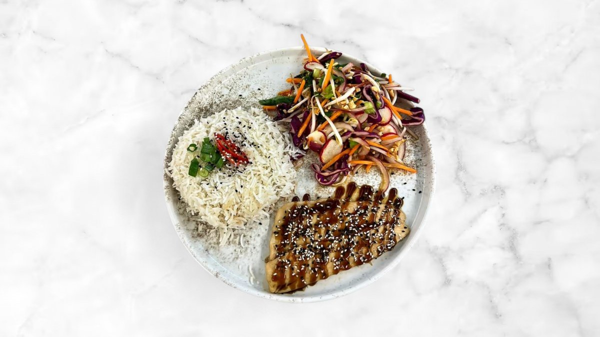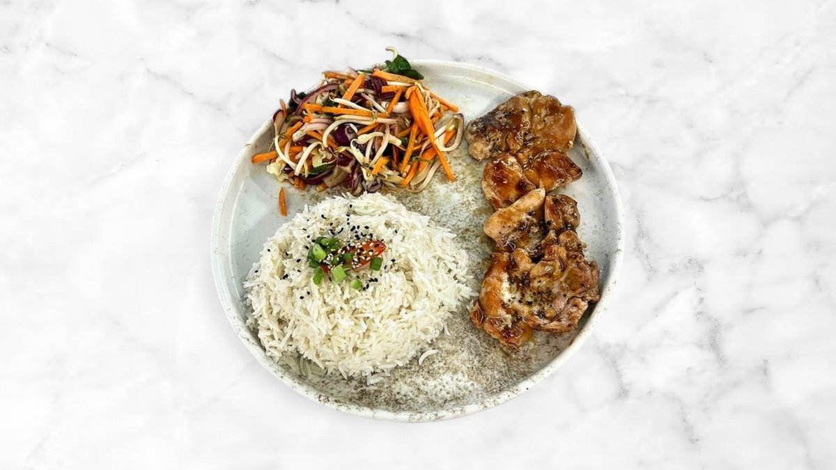 פרגית צלויה ברוטב אסיאתי ושומשום בליווי אורז לבן וסלט עלים אישי