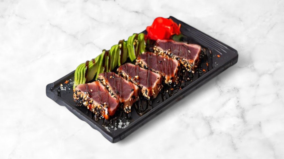 נתח דג צרוב, מצופה שומשום על מצע אבוקדו ורוטב טריאקי
