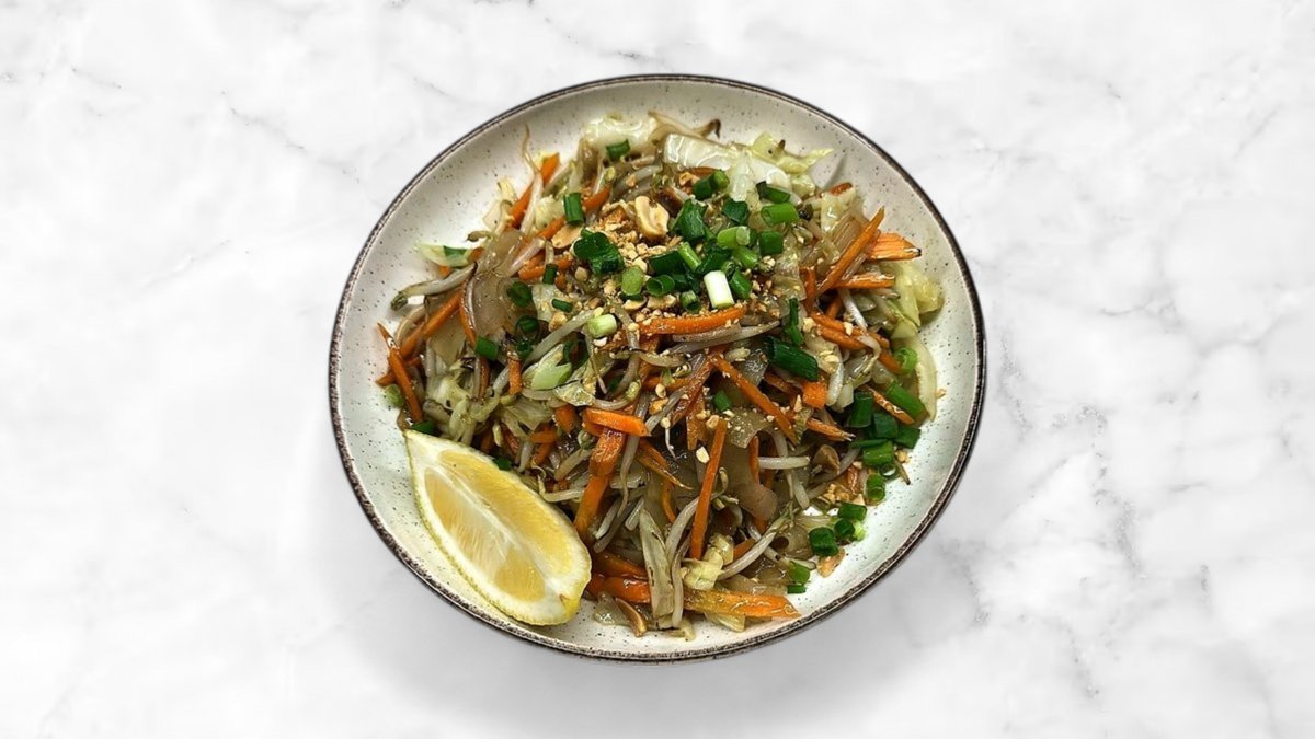 אטריות אורז בווק עם חלבון לבחירה, גזר, ביצה, כרוב, נבטים, שום, בצל ירוק ברוטב סויה, תמרהינדי ובוטנים גרוסים יחד עם פלח לימון