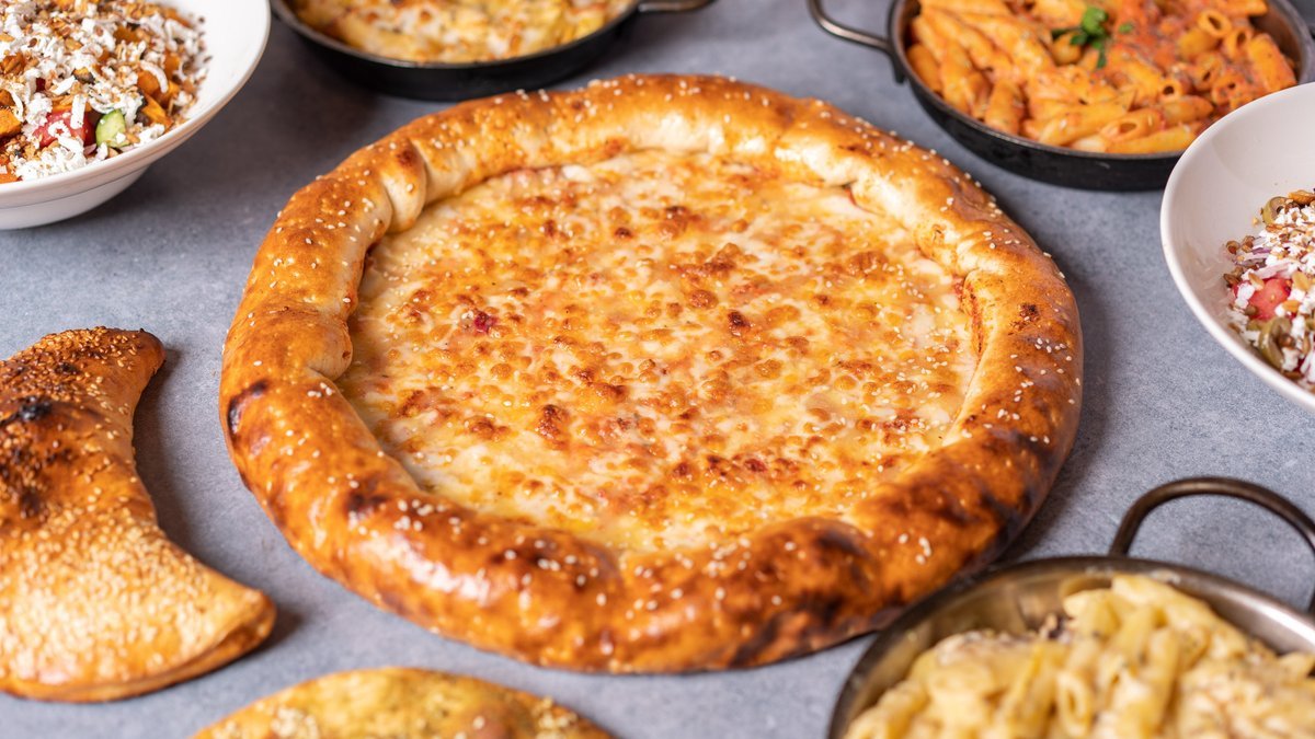 פיצה משפחתית כפולה, ממולאת בגבינה צהובה ומוצרלה. מוגש עם שתי תוספות לבחירה