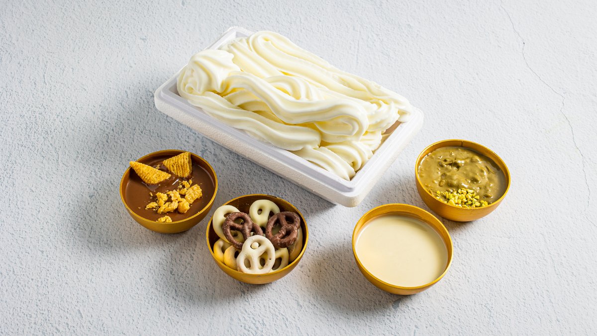 גלידה בגודל L, עד 4 טעמים, מגיע עם חמישה גביעים גדולים וארבע מיני גביעים