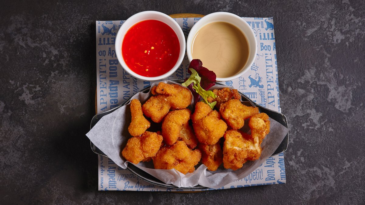 פרחי כרובית מצופים מוגש עם טחינה גלומית וצילי מתוק