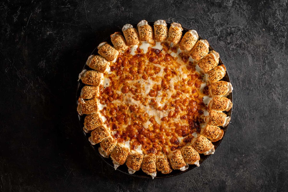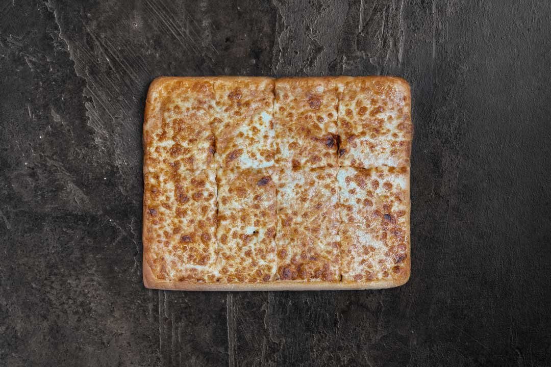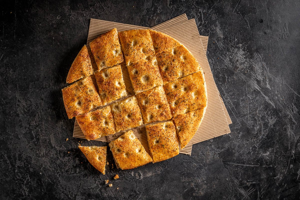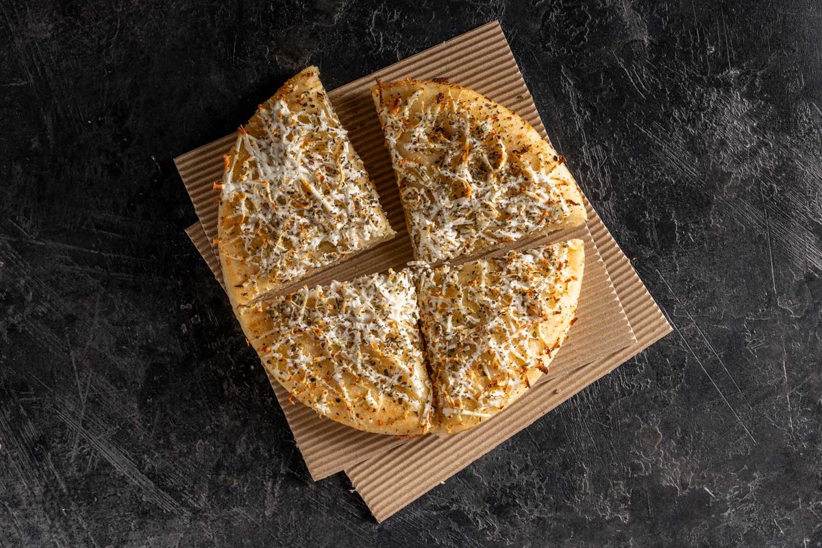 פיצה מבצק דק עם 28 נגיסי גבינת מוצרלה בשוליים, שומשום, קצח ושום. ניתן להוסיף תוספות בתשלום