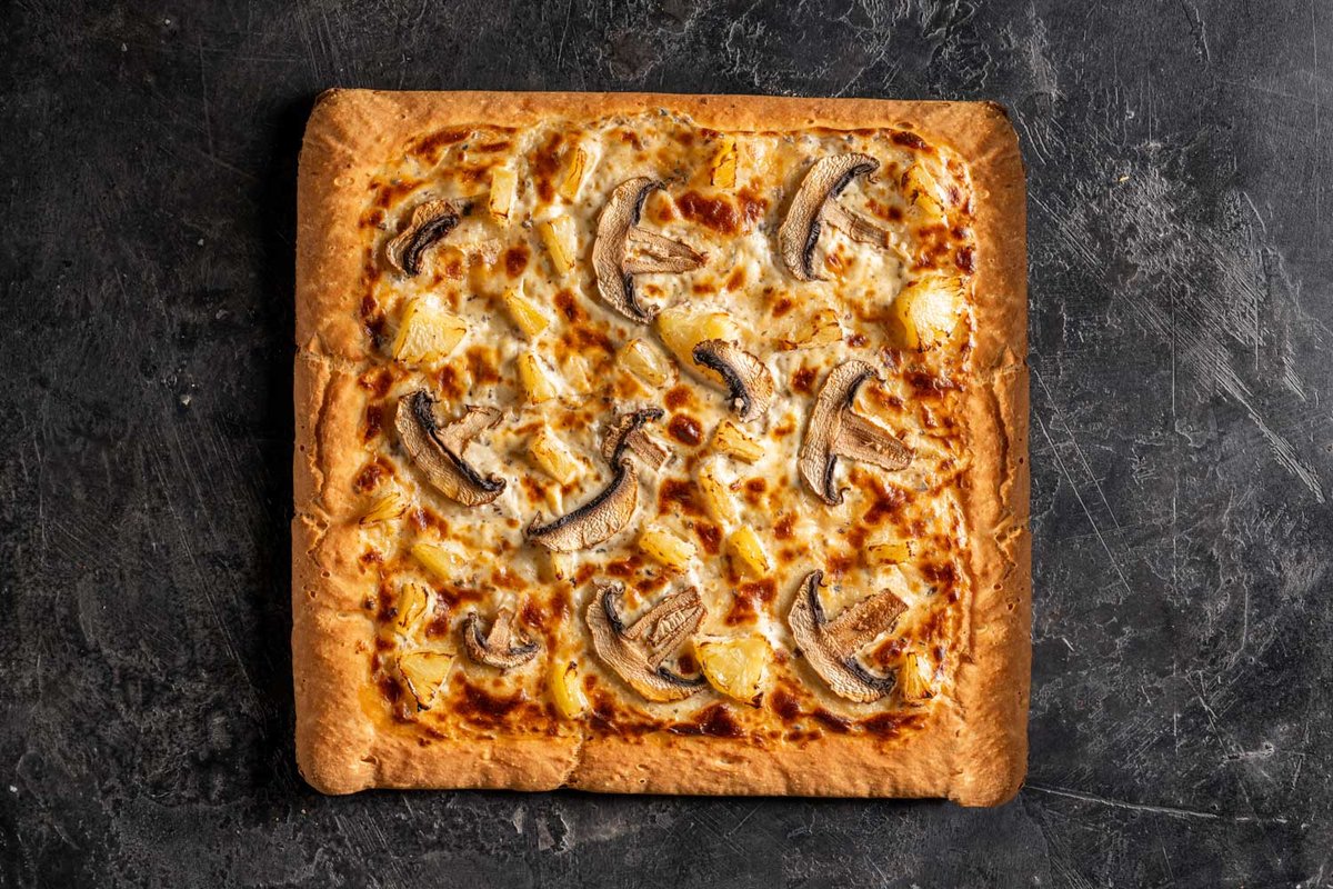 פיצה מבצק דק ללא גלוטן עם גבינה טבעונית של משו משו. ניתן להוסיף תוספות בתשלום