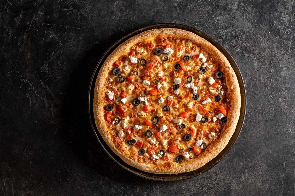 משפחתית מבצק עבה, עם עגבניות, פטה וזיתים שחורים
