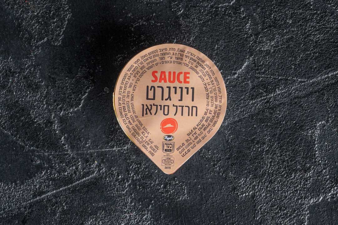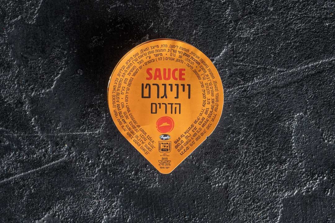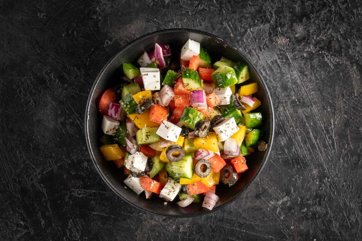 מלפפון, עגבניה, פלפל אדום, זיתים שחורים, בצל, גבינת פטה. מתובל בזעתר ושומשום