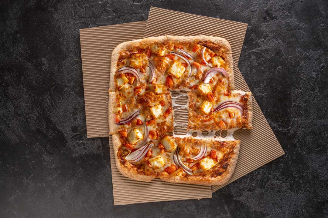 פיצה משפחתית דקה עם השילוב המנצח חלומי, בצל סגול וקוביות עגבנייה