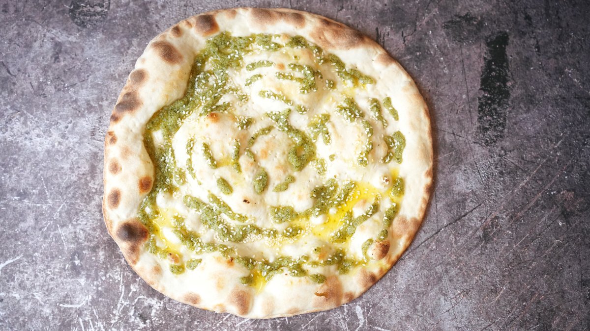 פיצה בתוספת פסטו , גבינת עיזים , ועגבניות