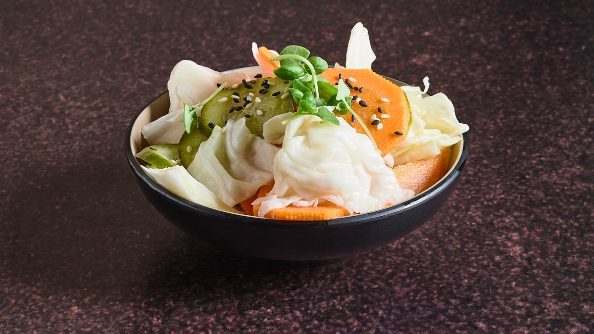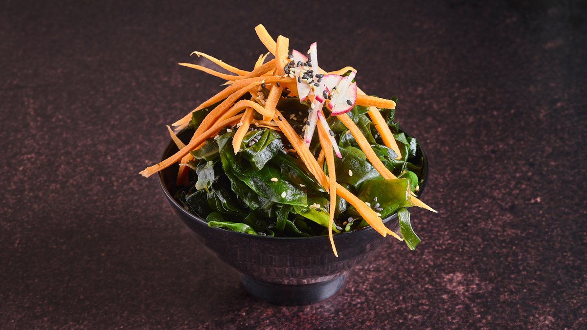סלט על בסיס אצות וואקמה, מלפפון, גזר, קולורבי מוחמץ ורוטב פונזו