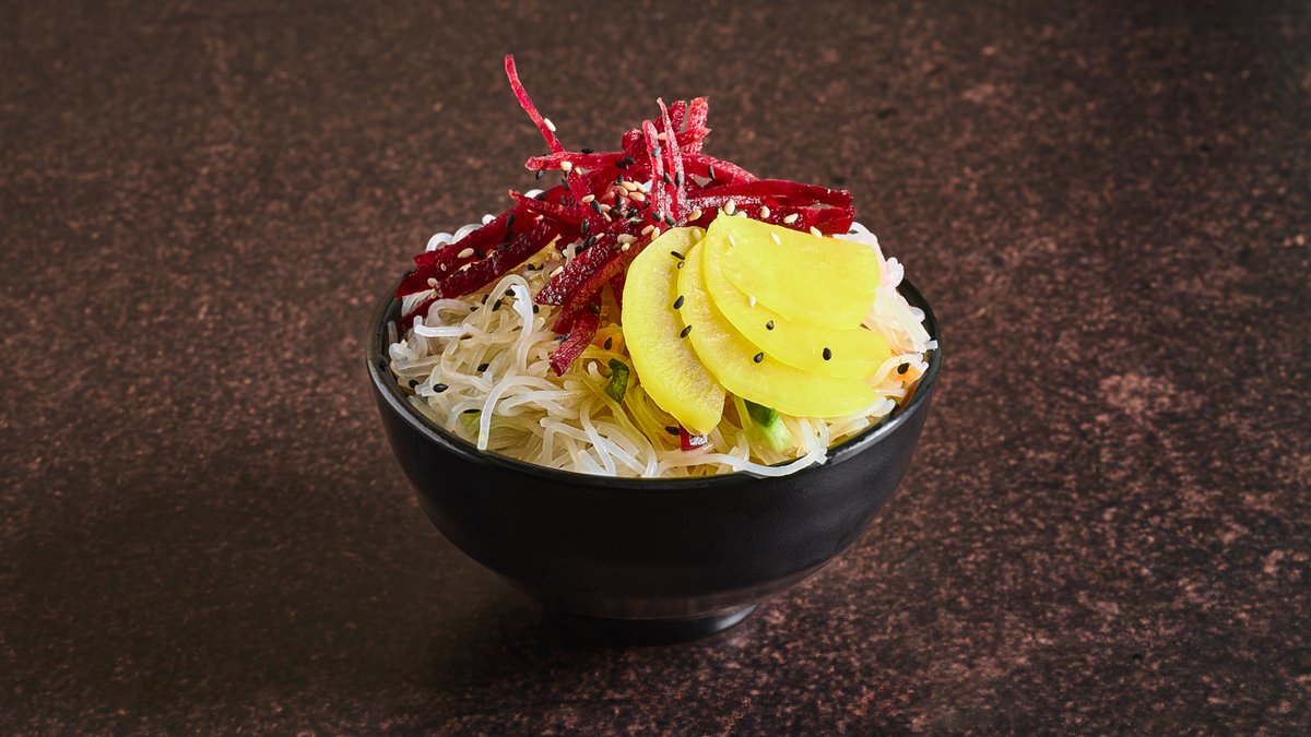 סלט על בסיס אטריות שעועית בתוספת סלק, אושינקו ורוטב פונזו