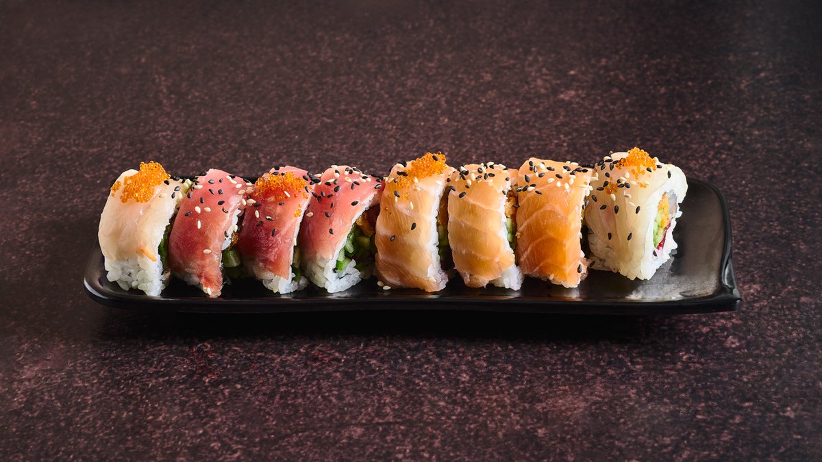 רול סלמון, טונה ודג לבן עם ירקות במעטפת דגים נאים, אצה שלמה