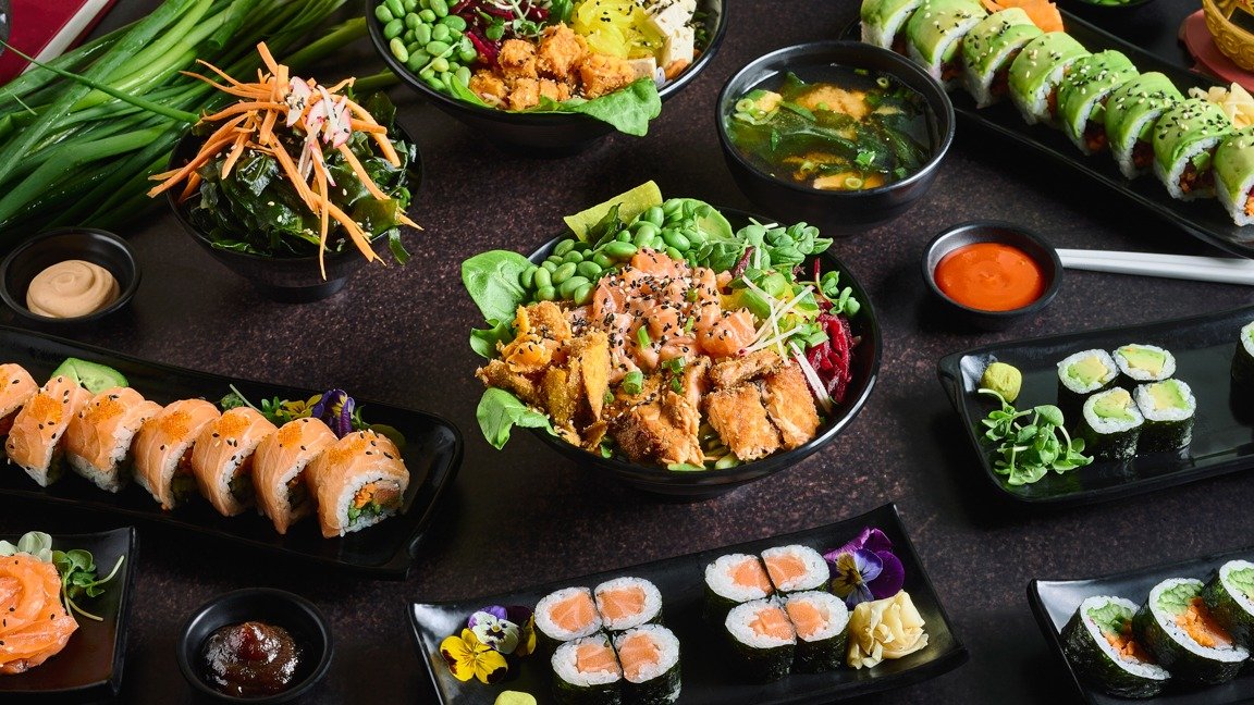 סושי מפורק על בסיס אורז - אצות, אטריות, גזר, מלפפון, נבטים, עליי בייבי, סלמון נא, סלמון טריאקי, סלמון סקין, סלק, אבוקדו, בצל ירוק, קולורבי מוחמץ, צנונית, אושינקו, בטטה