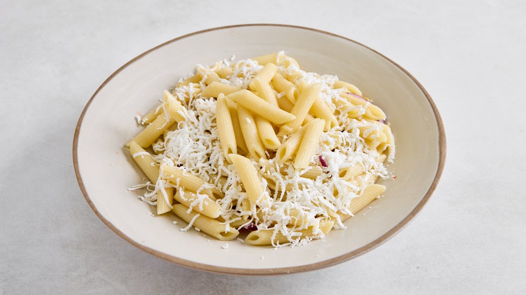 פסטה פנה, מלפפון, עגבנייה, גמבה, בצל סגול וגבינה בולגרית