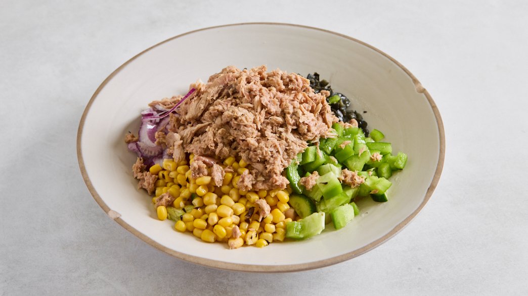 חסה, מלפפון, עגבנייה, זיתים שחורים, גמבה, תירס, בצל סגול וטונה