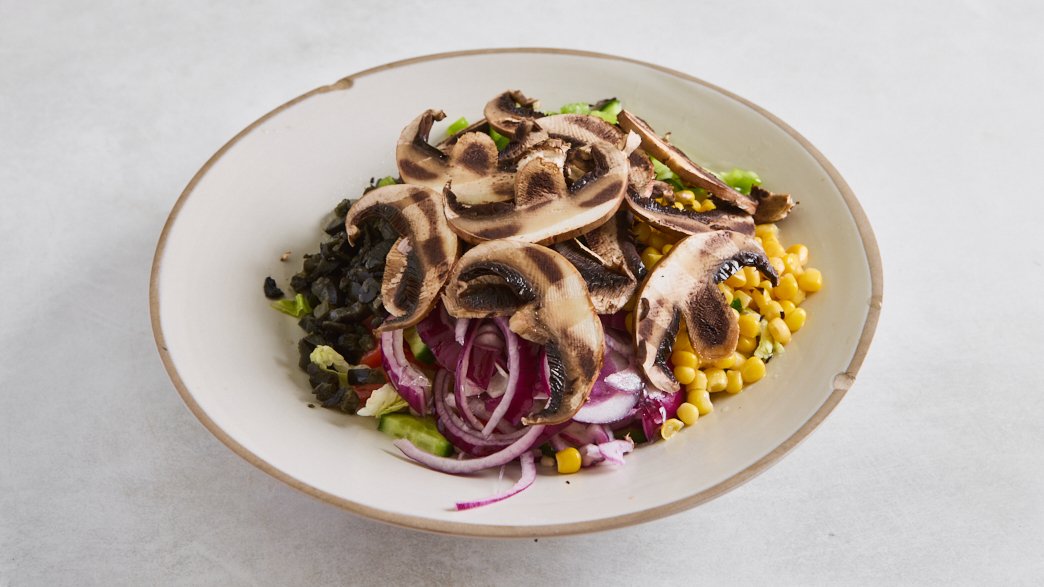 חסה, מלפפון, עגבנייה, זיתים שחורים, גמבה, תירס, בצל סגול ופטריות