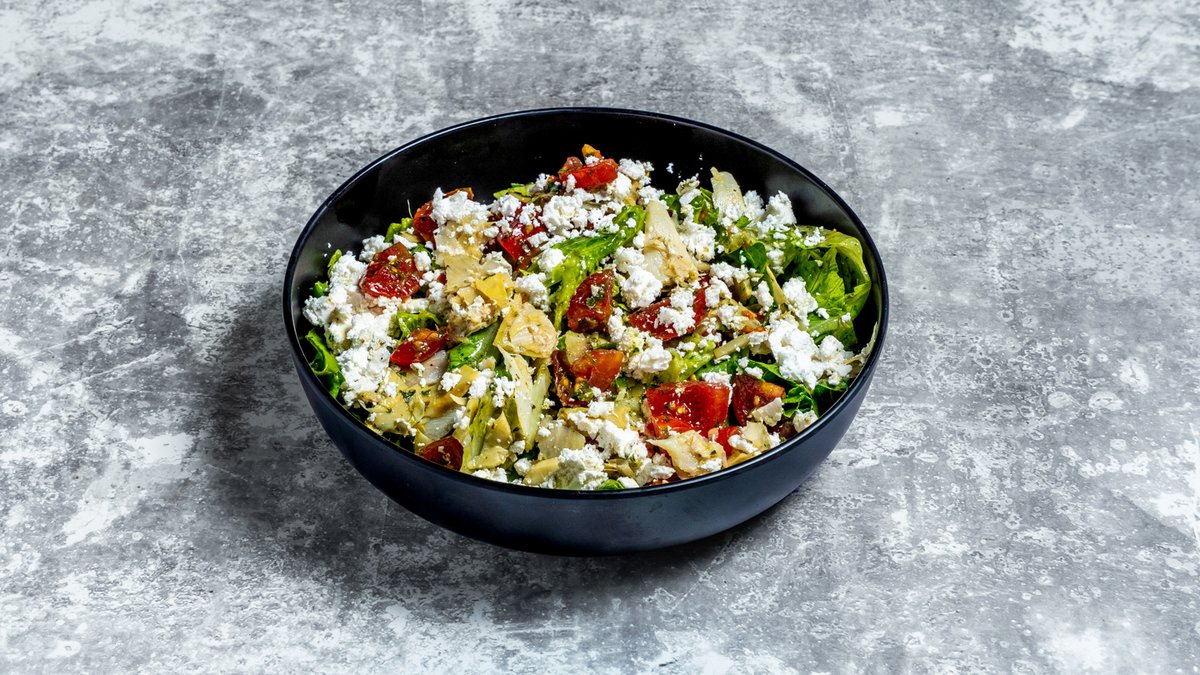 חסה, עגבניות שרי, פסטו, גבינה בולגרית, ארטישוק א-לה רומנה ושמן זית