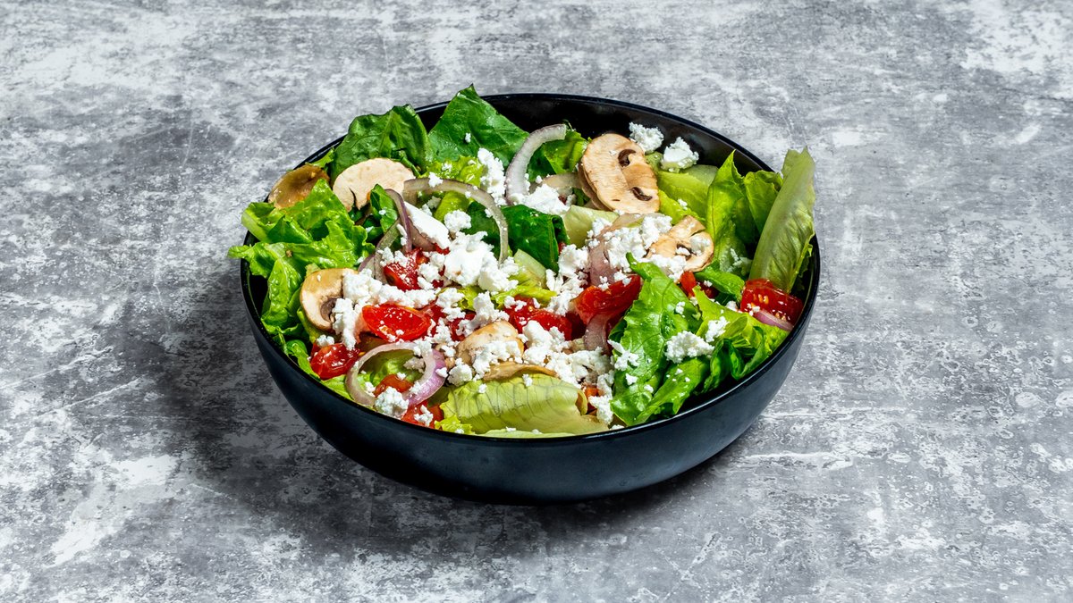 חסה, מלפפון, עגבניות,בצל סגול, פטריות, חלפיניו, תירס, אננס,זיתים, בולגרית, רוטב שום, שמן זית, פסטו, קורוטונים, עלי רוקט
