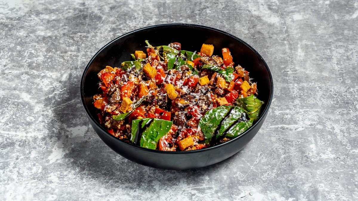 שרי, עלי בזיליקום, קרוטונים, בלסמי מצומצם, זיתי קלמטה, שמן זית ופרמז'ן