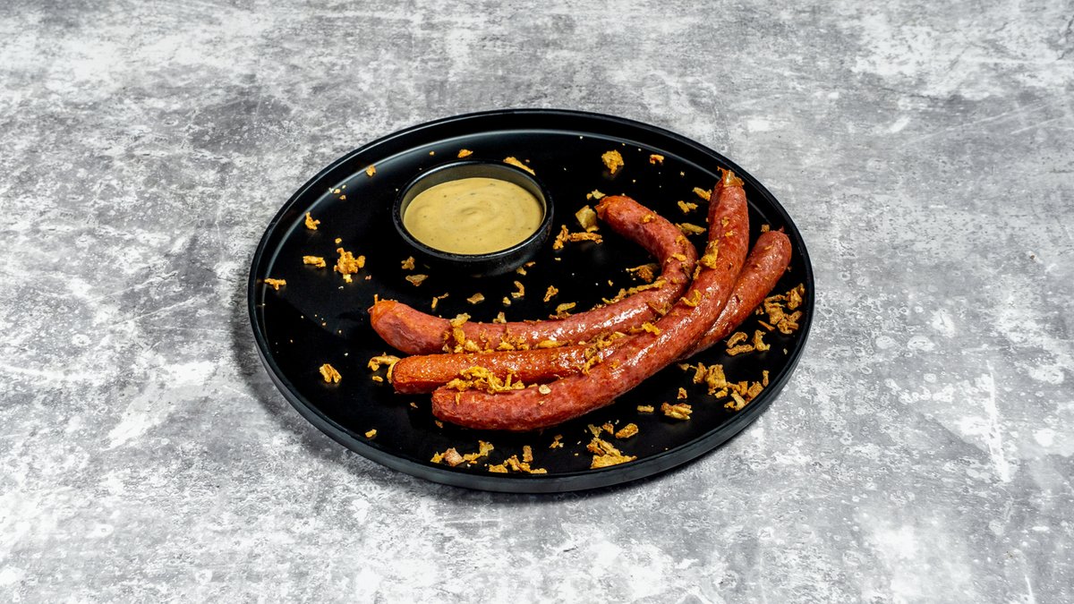 נקנקיות פטריצ'יאן מבשר לבן מטוגנות | בצל מטוגן | איולי חרדל שום קונפי