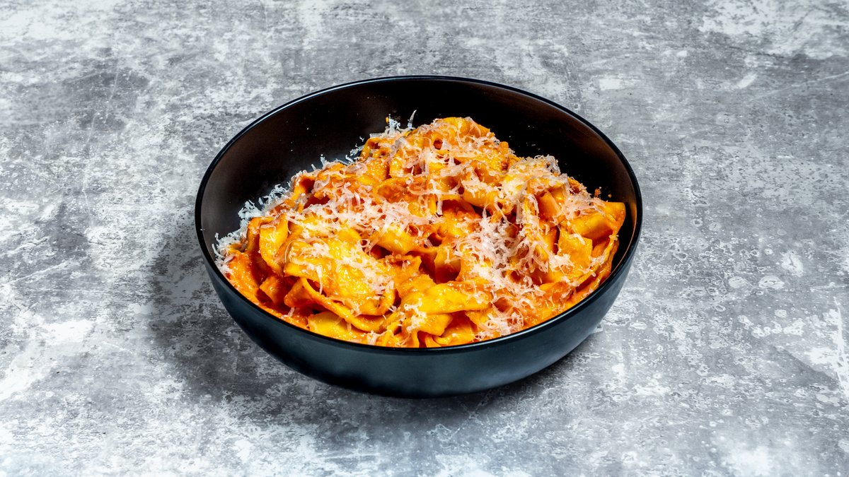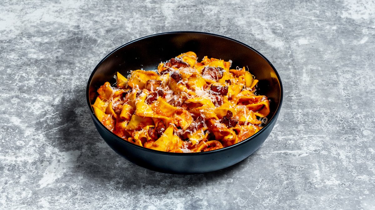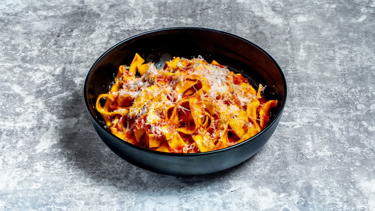 רוטב עגבניות סן מרזנו, צ'אנקים מוצרה פרסקה יבשה, עלי בזיליקום ופרמז'ן