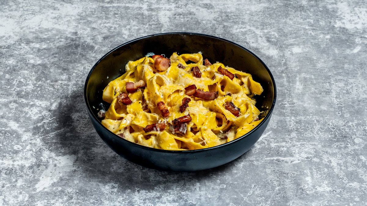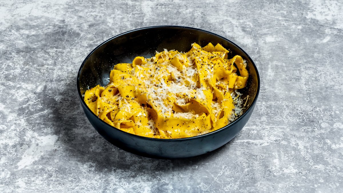 פקרורינו רומאנן , פלפל שחור , חלמון , בייקון בסגנון גוואנצלה , פרמזן רגאנו