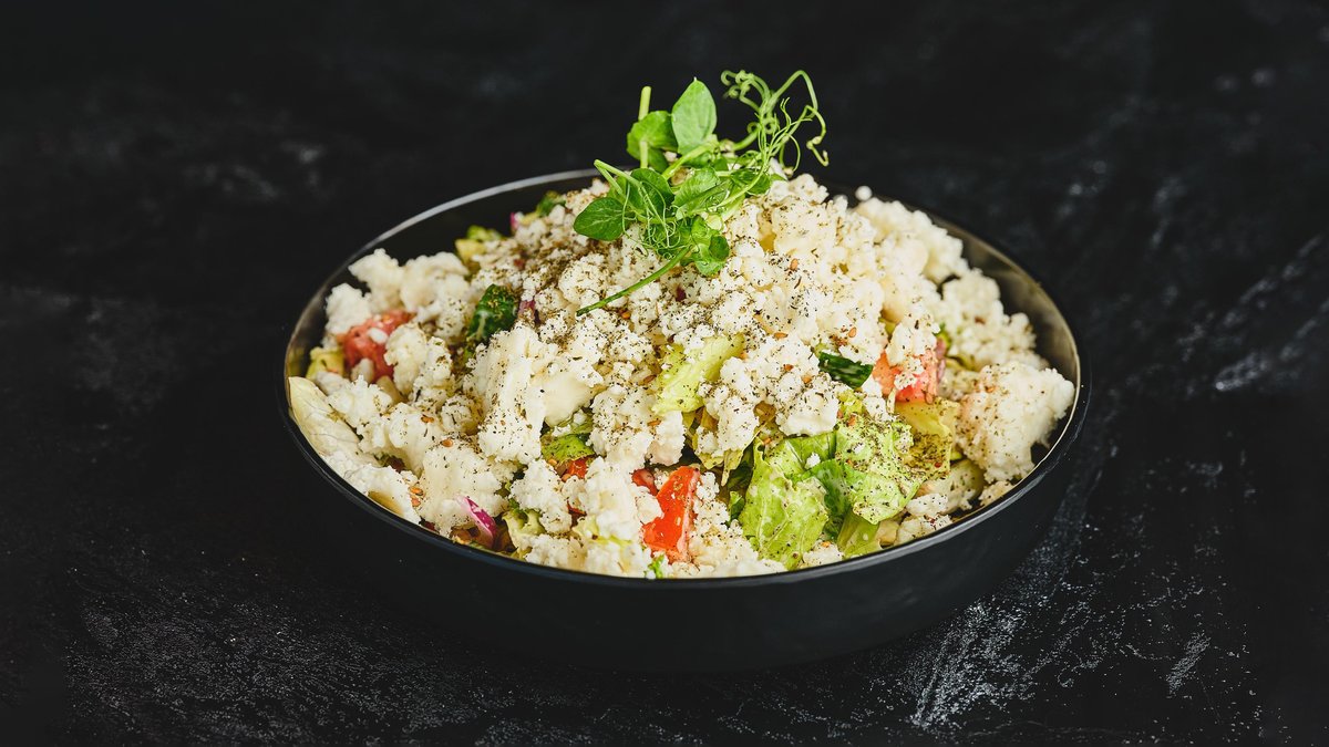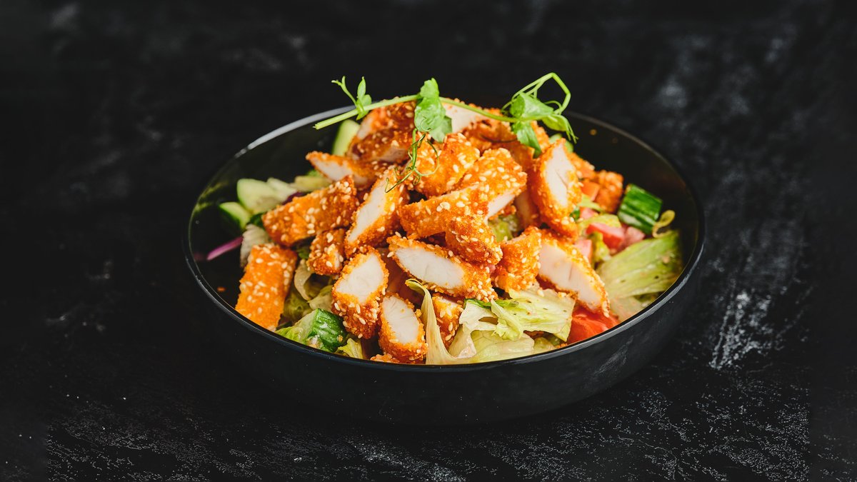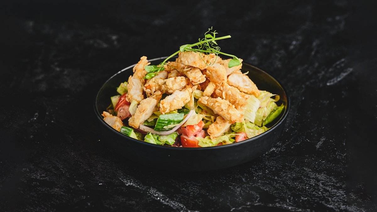 חסה, עגבניה, מלפפון, בצל סגול וזיתי קלמטה בתיבול רוטב נענע עם קריספי עוף בציפוי פצפוצי אורז