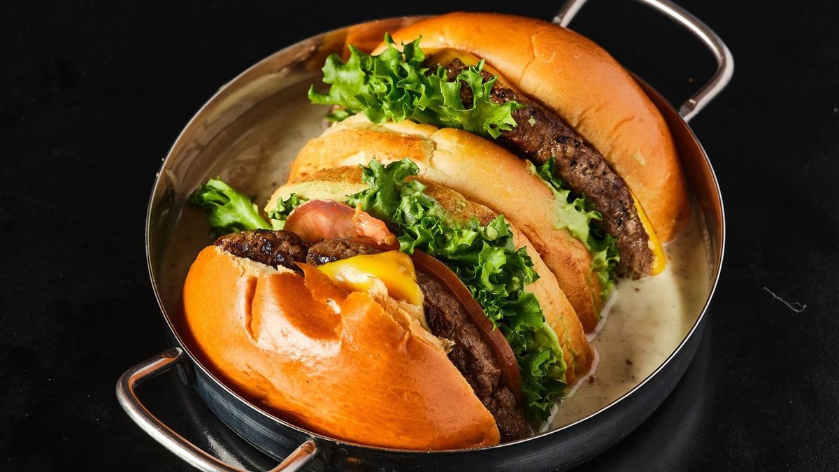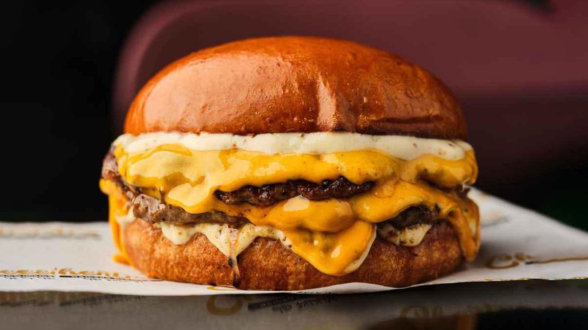 200 גרם בשר אנגוס, עם גבינת צ'דר, גבינת גאודה, ארוגולה, איולי הבית ובצל סגול בלחמניית בריוש עם קראסט שום