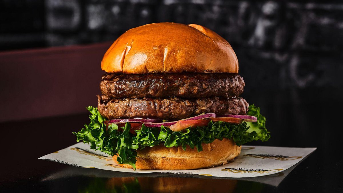 שתי קציצות (150 גרם) של בשר בקר טרי, עגבנייה, חסה, מלפפון חמוץ ורוטב הבית | מוגש עם צ׳יפס