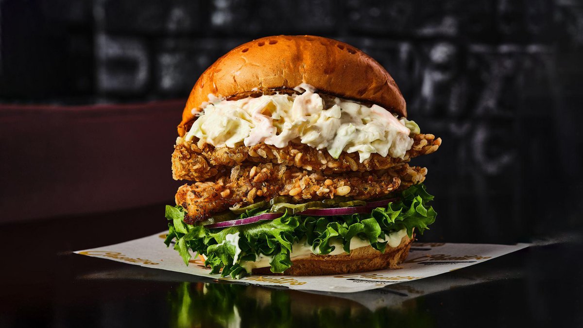 נתח עוף מצופה וקריספי עסיסי במיוחד, מוגש בלחמנייה טרייה עם חסה, מלפפון חמוץ, עגבנייה ובצל