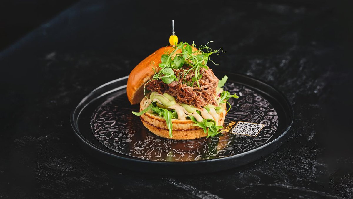 150 גרם של בשר בקר טרי, עם אסאדו מפורק, איולי צ'יפוטלה, ארוגולה, עגבנייה, גבינת מוצרלה, מלפפון חמוץ ובצל