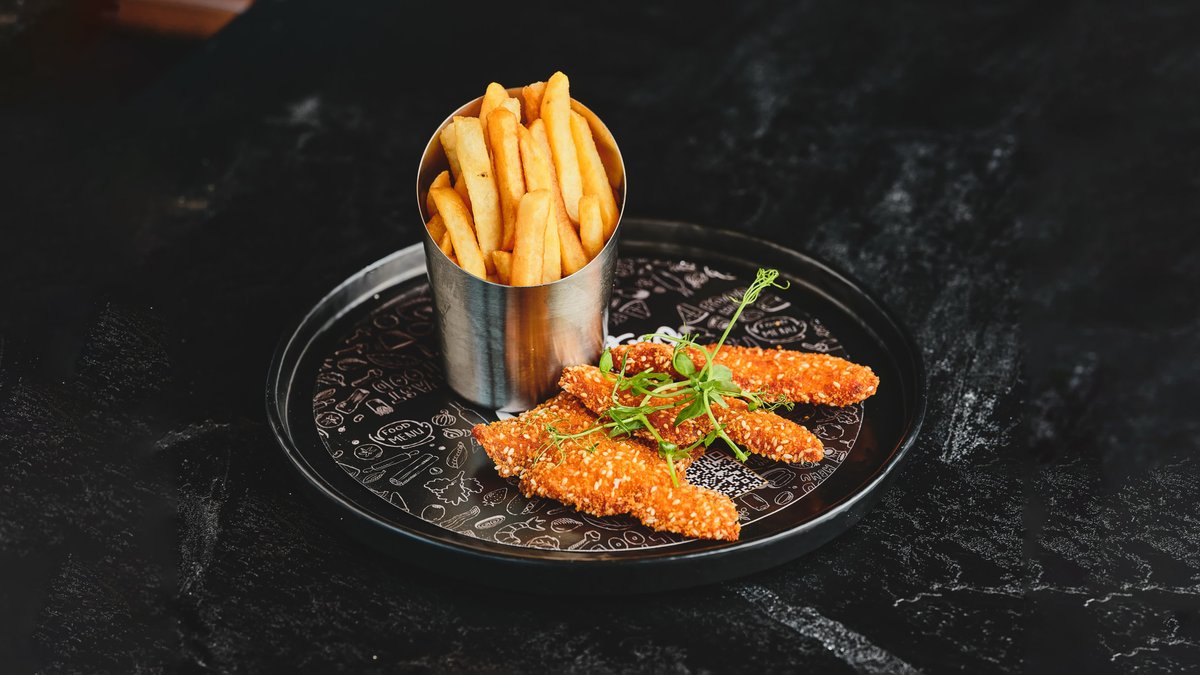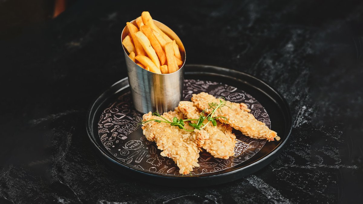 נתחי קריספי עוף, סלט קולסלאו, איולי פסטו, מלפפון חמוץ וחסה | מוגש עם צ׳יפס