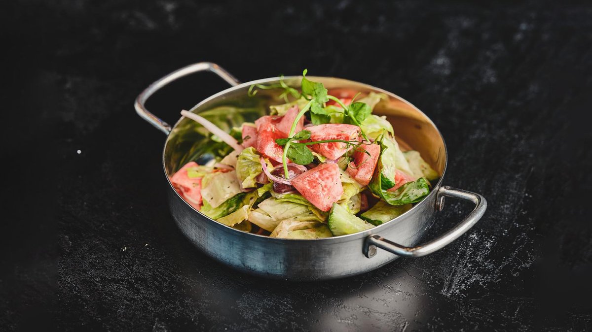 חסה, מלפפון, עגבנייה, בצל סגול, זיתי קלמטה בתיבול רוטב נענע עם גבינת פטה