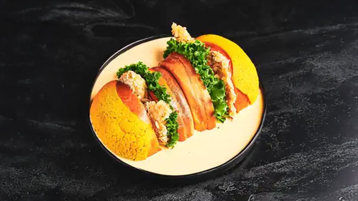 קריספי עוף בציפוי פצפוצי אורז עם רוטב צ'ילי מתוק מעל, איולי פסטו, חסה, מלפפון חמוץ, עגבנייה ובצל סגול בלחמניית בריוש עם קראסט תירס
