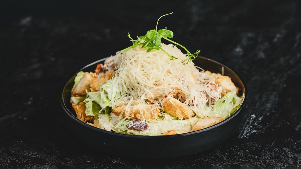 לבבות חסה עם רוטב קיסר, בצל סגול , קרוטונים, פרמז׳ן ונתחי עוף קריספי
